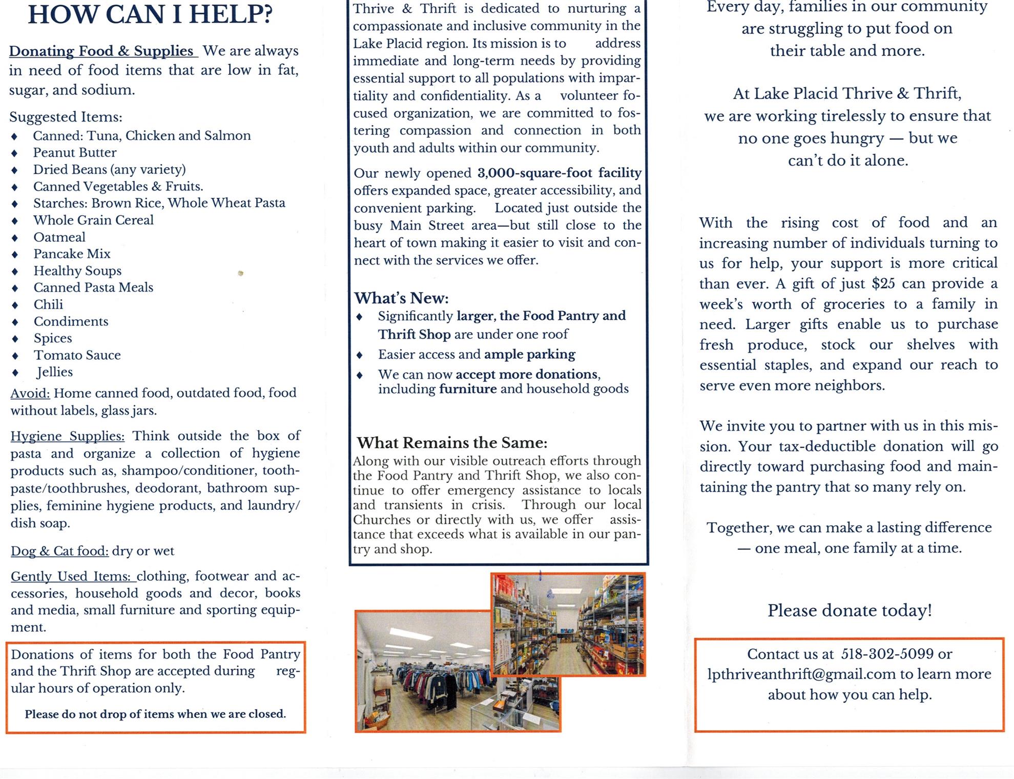 Pastor Jim Koenig, Board Chair of Thrive & Thrift spoke about the success story which demonstrated the generosity and strength of our community. He spoke about the beginnings of the organization and how it outgrew the original locations. In 2024, a 501c3 was formed with the community raising sufficient funds to construct a new modular facility. Almost 70 volunteers work at the organization which maintains strong partnerships with faith organizations, the Town, the Village and the school system. Jim said that if anyone comes to the food pantry door on pantry day, assistance is provided without question. Thrive & Thrift’s informational brochure is presented here. Besides donations of food and goods, monetary donations are always welcome. There’s always a need for more volunteers.
